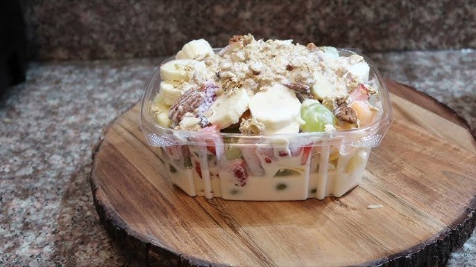 Platano, papaya, uva, manzana, fresa, con crema tradicional, arriba coco tostado y grano la.
